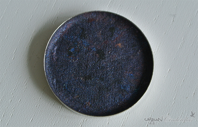 Was für eine wundervolle Farbe. Im Pfännchen sieht sie auch total spannend aus. Eine dunkelblaue Basisfarbe mit klitzekleinen mittelblauen, schwarzen, orangenen und auch violetten Anteilen.