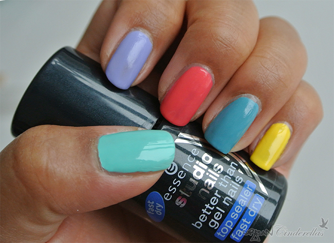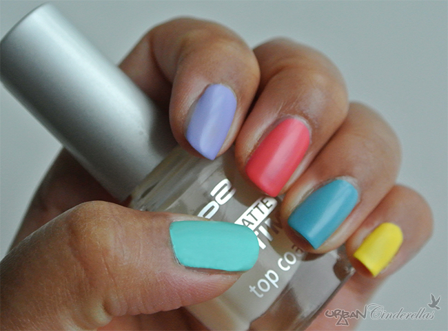 So sah das ganze dann mit jeweils zwei Schichten Lack plus Better Than Gel Nails Top Sealer aus. Das war mir dann aber irgendwie doch zu knallig für eine Frühlingsmaniküre. Dem konnte aber mit einer Schicht P2 Matte Victim abgeholfen werden. Der matte Topcoat hat die Farben ein wenig getrübt und ließ sie dadurch etwas pastelliger wirken: