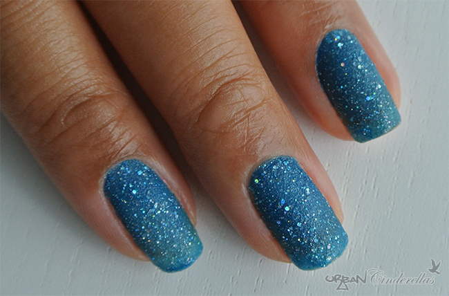 Get Your Number ist ein hell-mittelblauer “sandiger” Jellylack mit mittelgroßen Glitzerpartikeln die je nach Lichteinfall mehr silber, orangepink oder hellblau glitzern.